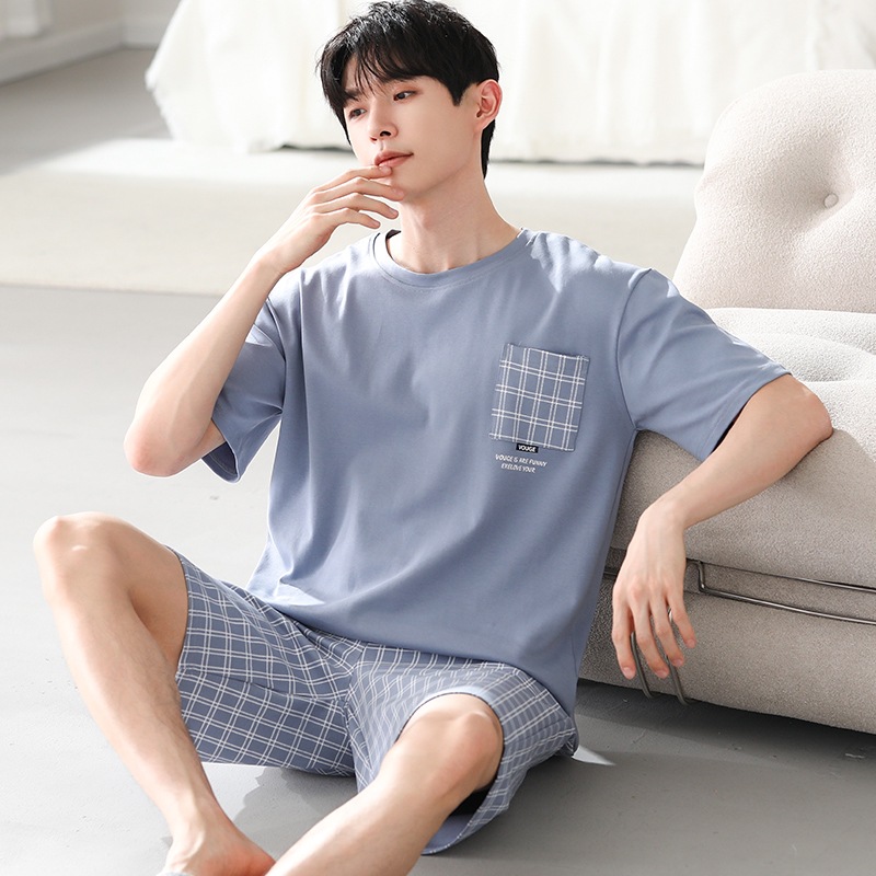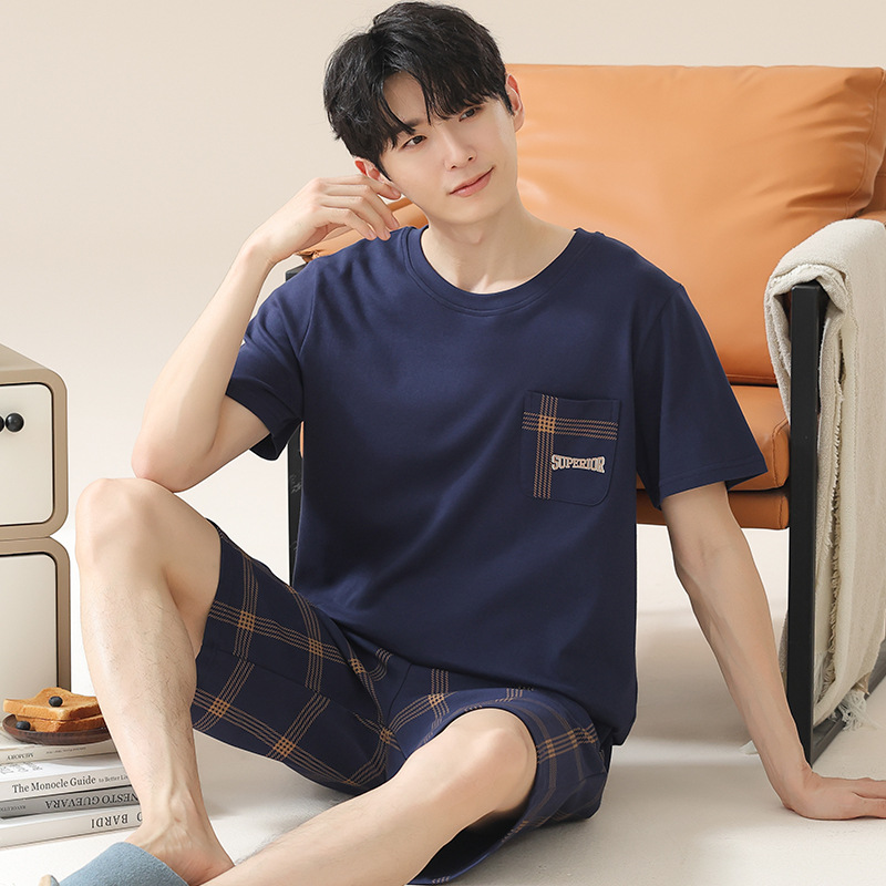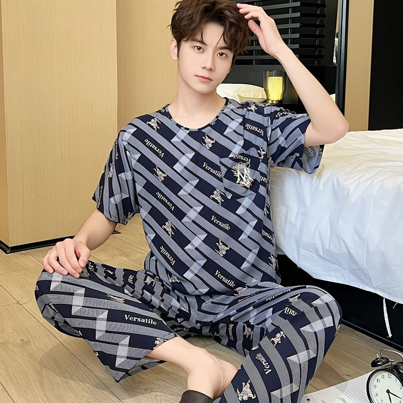 男性純綿パジャマ男性夏カジュアル春と秋の薄い家庭服セット半袖青年夏プラスサイズ