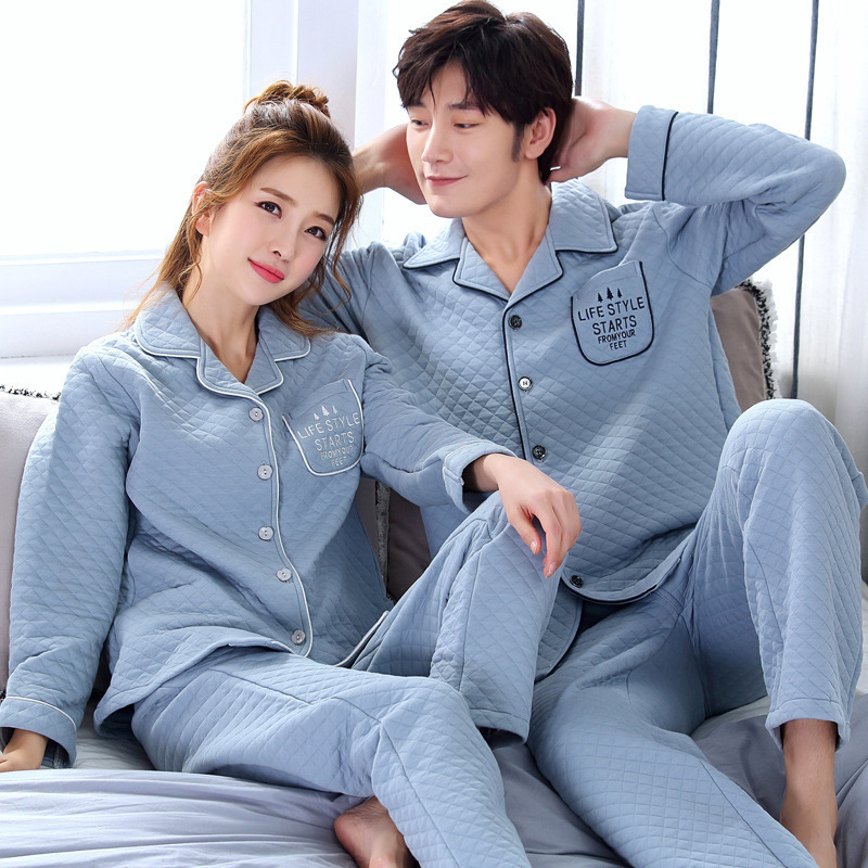 秋冬のカップルのパジャマの女性の薄い綿の長袖の純綿の3層の綿を挟みます。