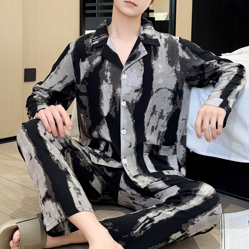 パジャマメンズメンズ春秋 2025 新しい綿シルク長袖春秋ボーイズ水墨画ホーム服セット