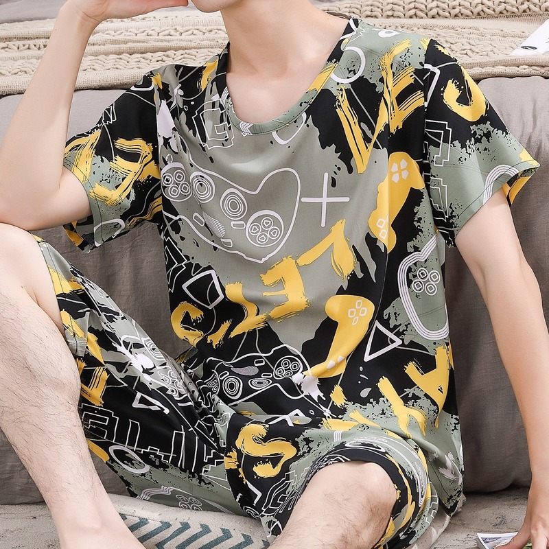 男性用パジャマ夏の綿シルク半袖ルーズ漫画大きいサイズツーピースショーツティーンエイジャーかわいいホーム服セット