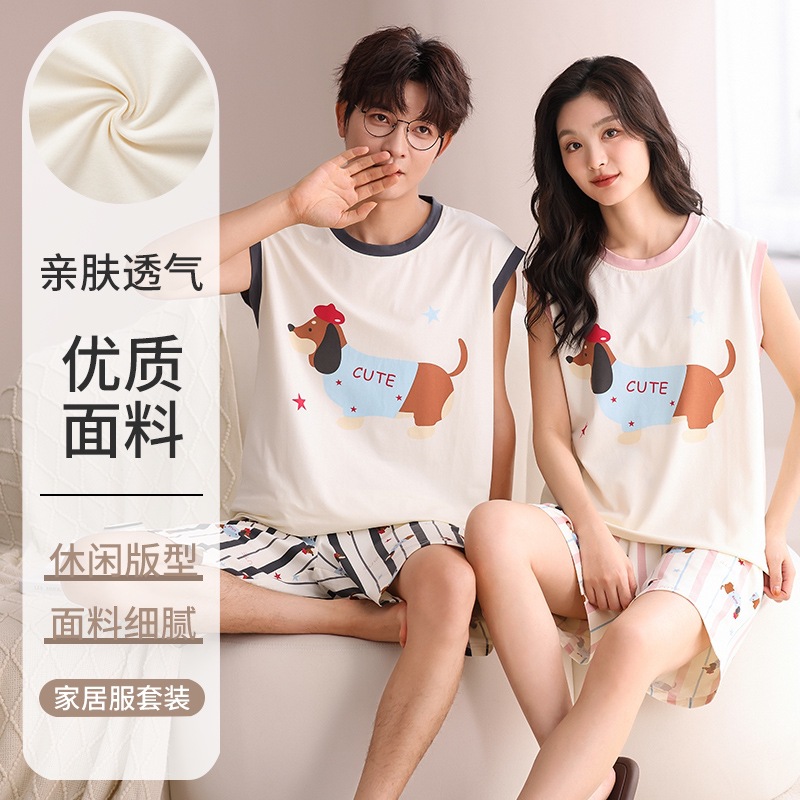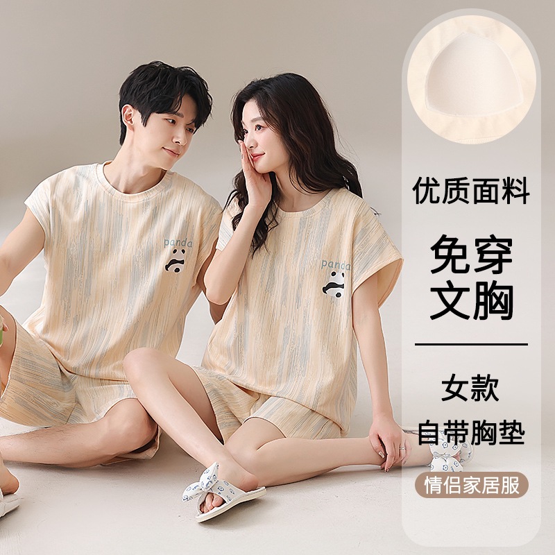 胸パッド付き女性用パジャマ、夏の新作ベストショーツ、メンズ純綿ラウンドネックカップルホーム服、綿2点セット
