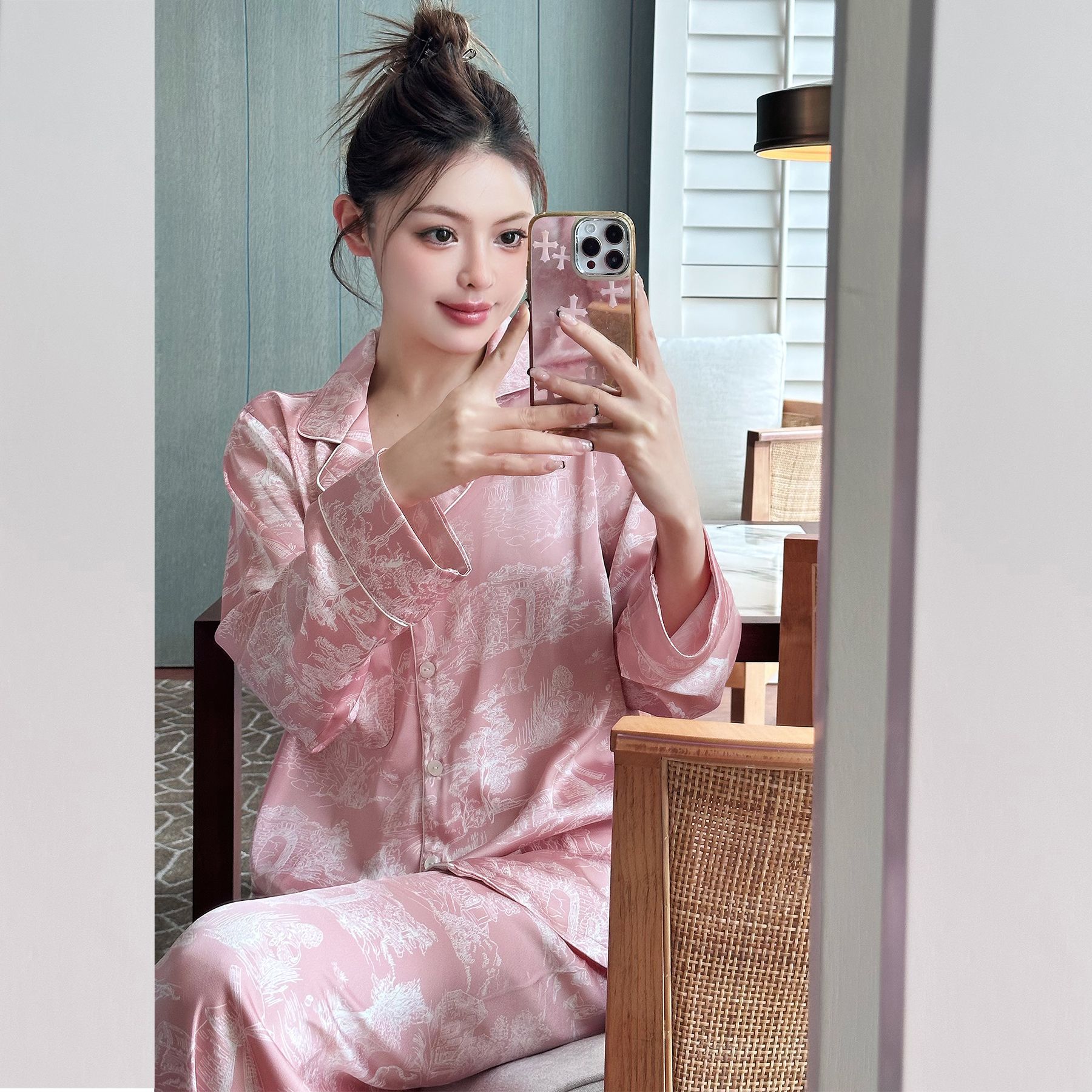 赤い本の推薦金のアルファベットのジャカードのサテンの長袖のズボンの氷の糸のパジャマの女性の秋のスーツのシルクの家の服は新しいです。