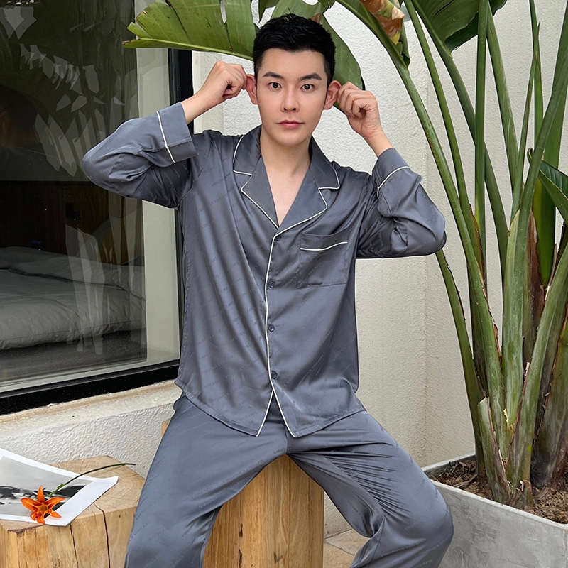赤い本は男性のアルファベットのジャカードの氷のパジャマの男性の秋のスーツの長袖のズボンの絹織物の家の服のスーツを推薦します。