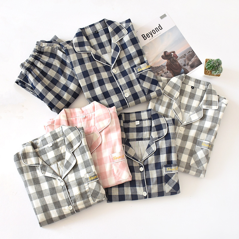 二重の糸の家の服のパジャマの綿の女性の純綿の日本の春と秋の無印の男性のカップルの良品の布帛はサイド縫い目がありません。