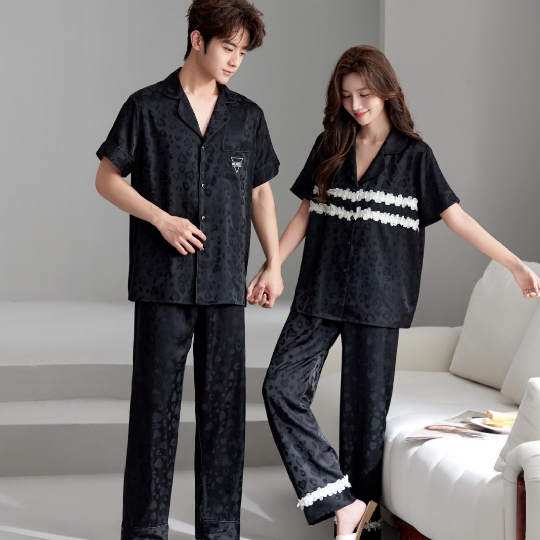 カップルパジャマ、女性用夏アイスシルク半袖ズボン、男性用シンプルな大きいサイズパジャマ、高級カーディガン、カップルホーム服