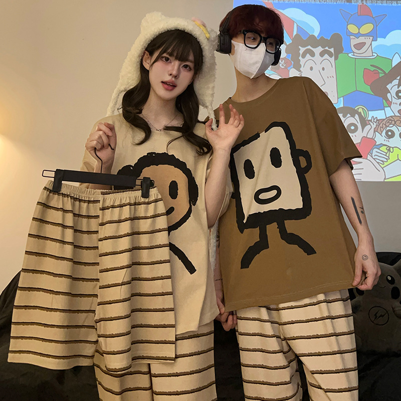 インターネットセレブ風漫画パジャマカップル衣装男性と女性のための夏かわいい純綿ホーム服新しい半袖 3 点セット