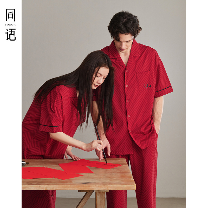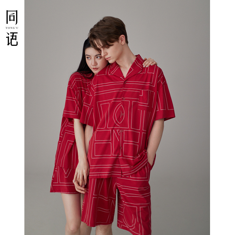 同語の新型カップルパジャマ夏の涼感純綿セット赤結婚祝い男性女性ホームウェア夏