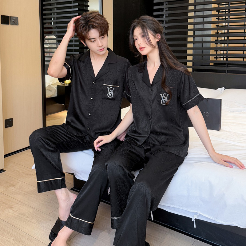 カップルアイスシルクパジャマレディースホットダイヤモンドジャカード半袖ズボンシンプル薄型ネットセレブ人気メンズホームウェアセット