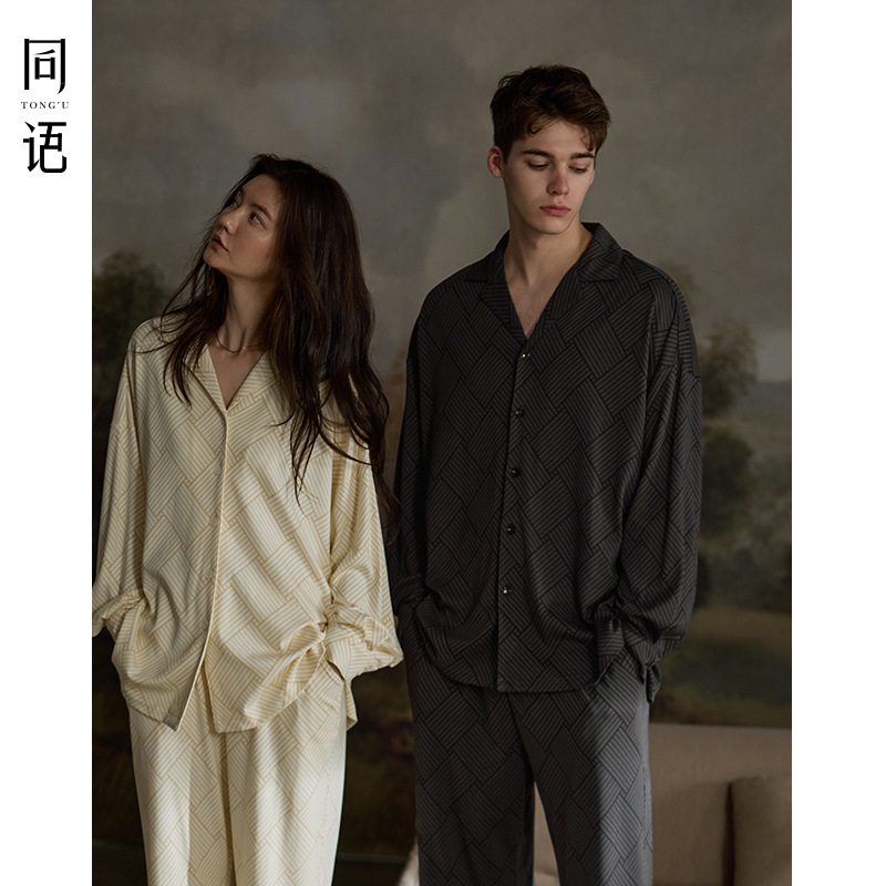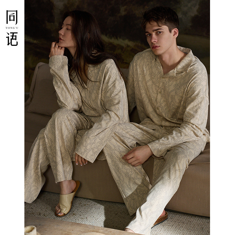 同語2024年新作パジャマカップル春と秋の柔らかい綿の家の服は長袖の男性の女性のスーツを着ることができます。
