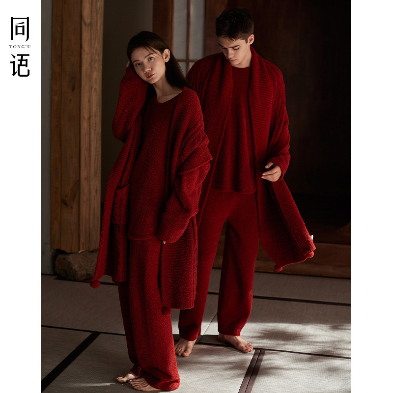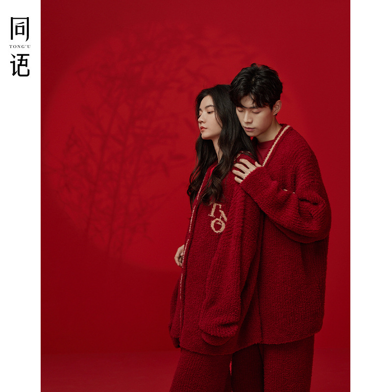 同语24年カップルパジャマ秋冬半分フリース赤结婚新婚男レディーススーツ冬ホームウェア