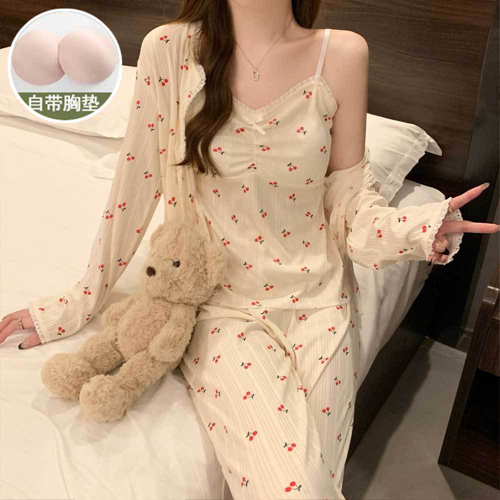 パジャマの女性の長袖のストラップのズボンの3つのセットは胸のパッドの純粋な欲の風の韓国版の甘い花の家庭服の春秋の金を持ちます。