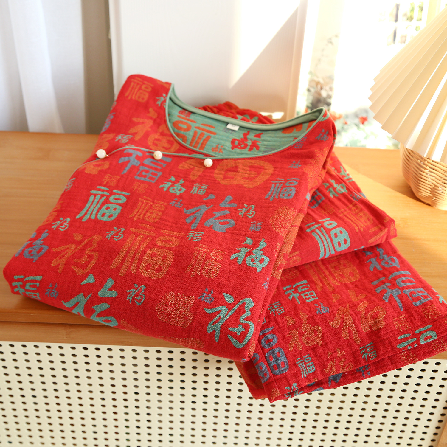 春と秋の純綿二重ガーゼレディースチェック柄パジャマセット、屋外でも着用可能、和風夏用ホームウェア、和風シンプル