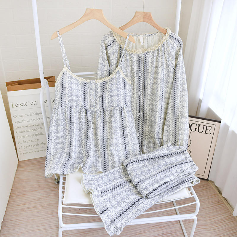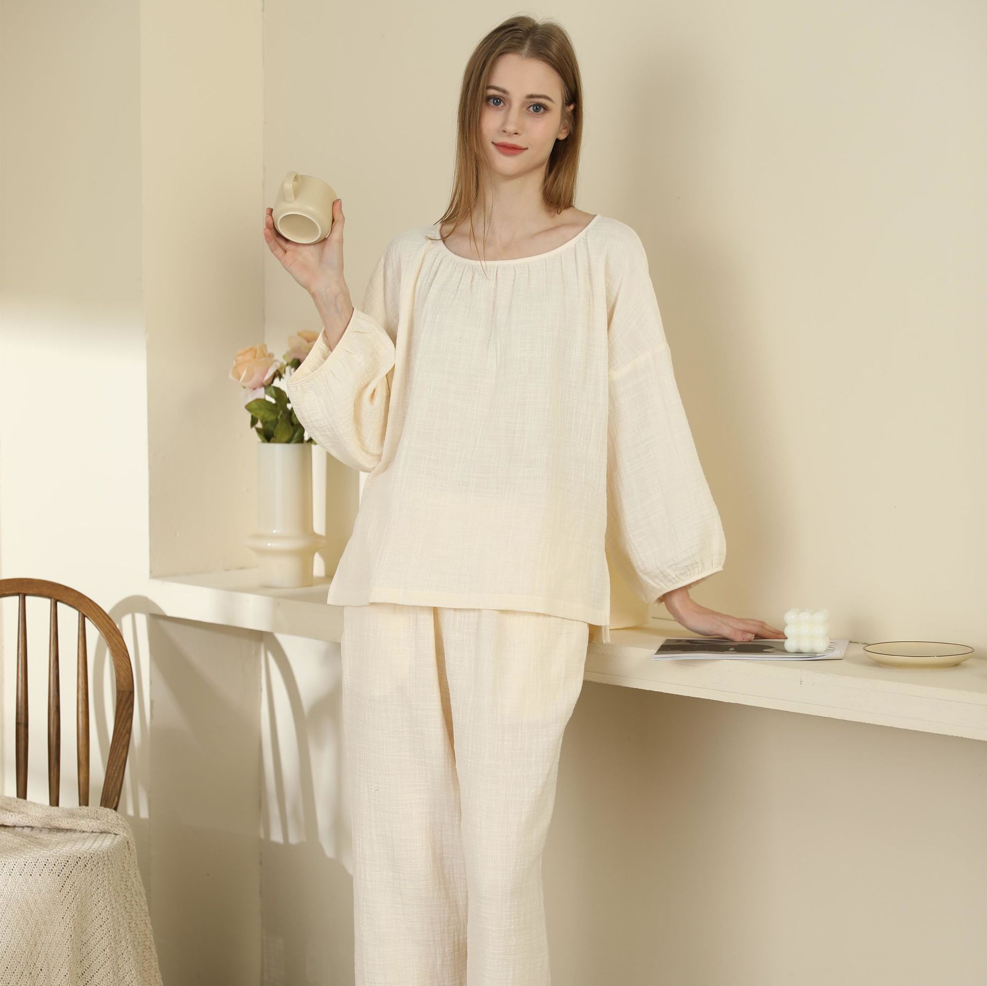 春夏の女性用パジャマ、ウォッシュドコットンクレープ、甘い新作ガーゼ二重層薄手長袖秋ホームウェアセット