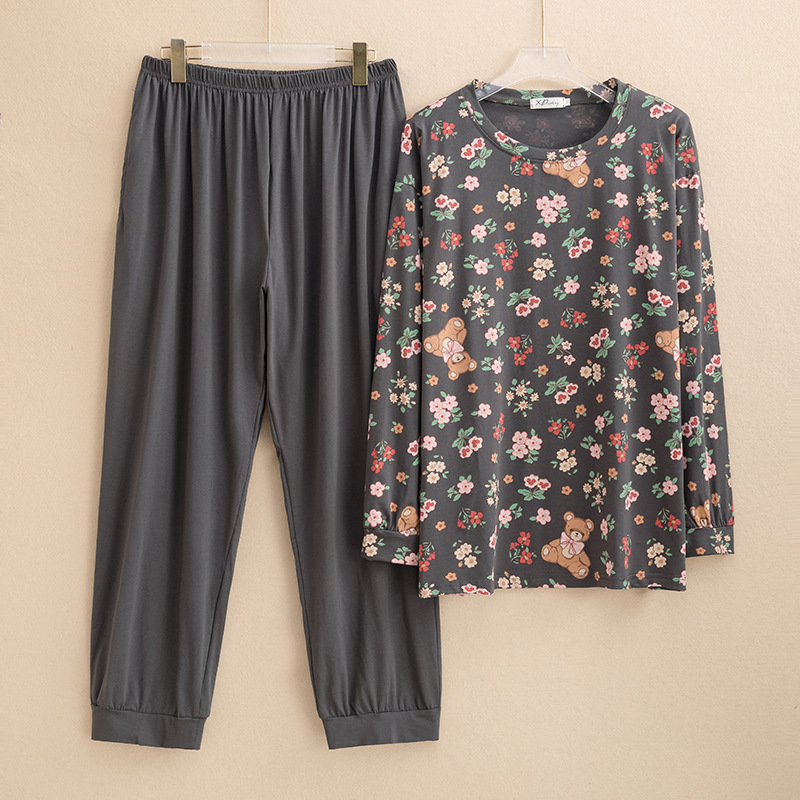 ニットの綿のパジャマの女性の春と秋の長袖のゆったりした丸首の頭の大きいサイズの家の服のシンプルなカジュアルな花のスーツ
