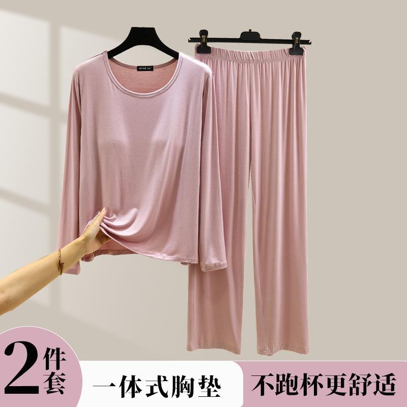 胸パッド付きパジャマ女性春と秋の薄いタイプの雲綿の長袖の長ズボンに太った大きいサイズの香風の家の服のスーツ