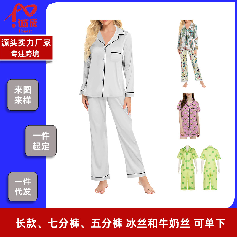 国境を越えた対外貿易の氷糸パジャマはカスタマイズされたプリント長袖の春夏は綿の男女パジャマの部屋服セットに似せている