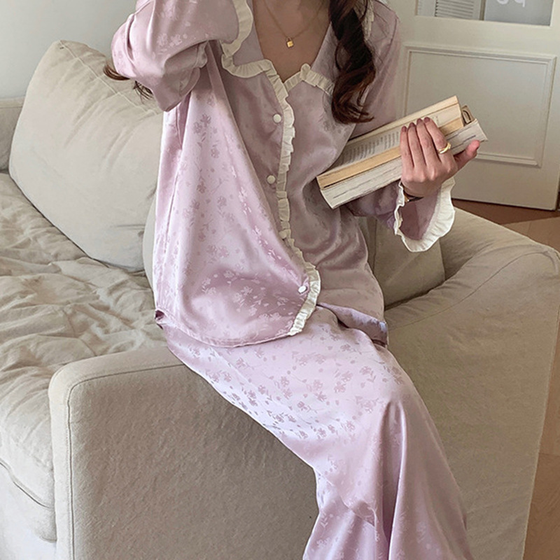 アイスシルクパジャマ女性のための春と夏の 2024 新しいジャカードフラワーステム長袖スーツアウターウェア春と秋のフランスの家庭代理店