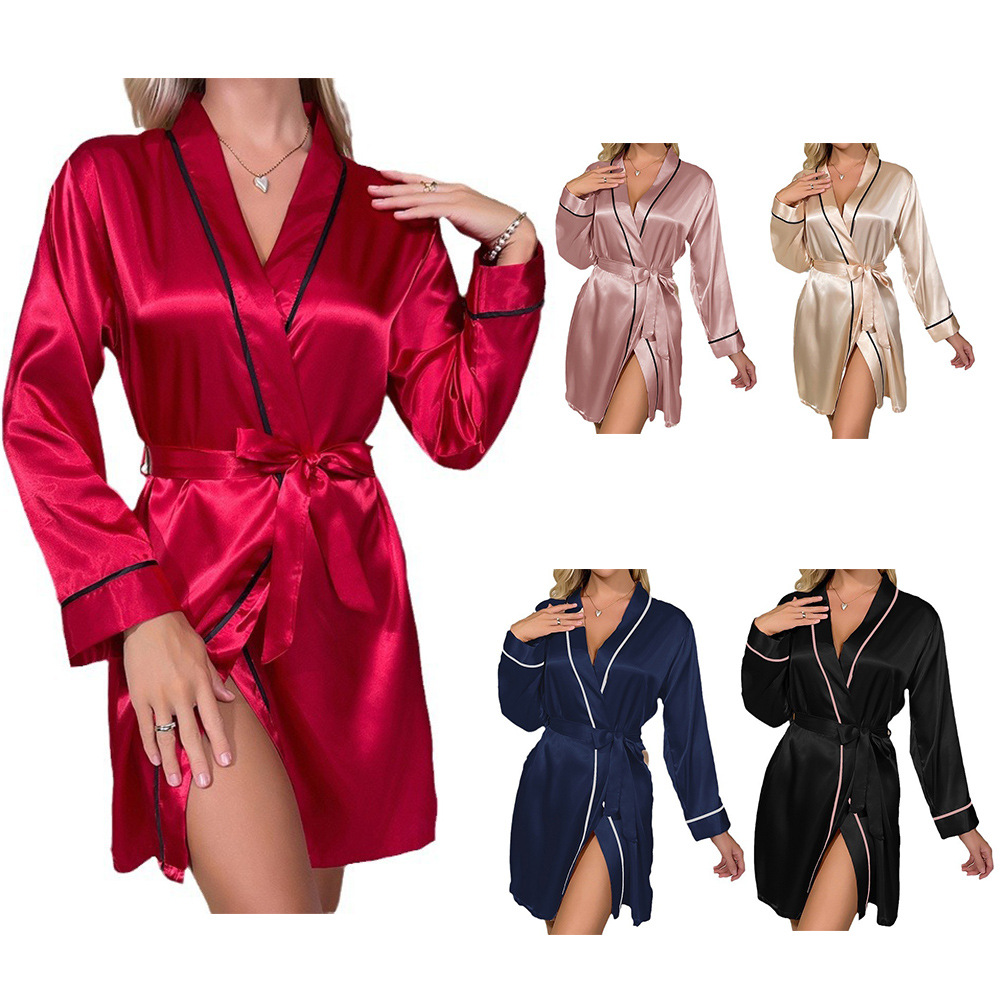 氷糸パジャマ女性浴室ストラップバスローブ夏シンプル通気性薄いファッション模造シルクカジュアル長袖パジャマ