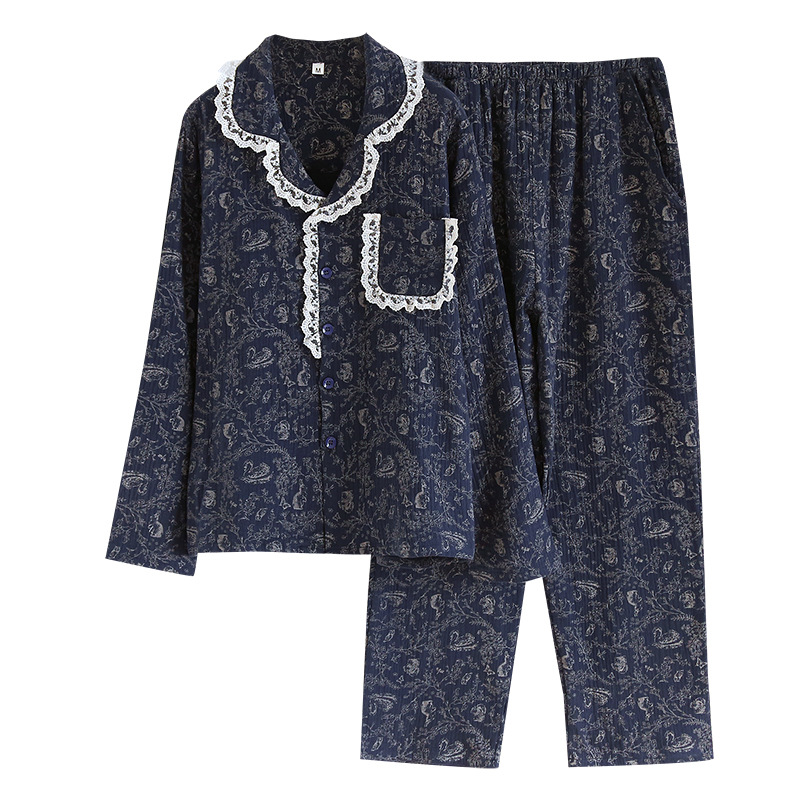 2024春夏秋の薄い綿のガーゼの縮みの青い夢の縮みの布の綿のレースのスーツのシリーズのパジャマの大きいサイズ