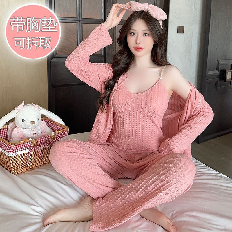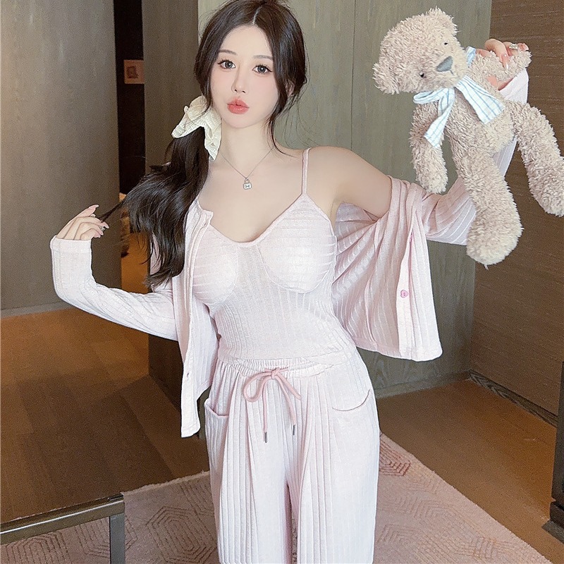 胸パッド付きパジャマ女性春秋新作6535コットンストラップカーディガン長ズボン甘美カジュアル三点セットホームウェア