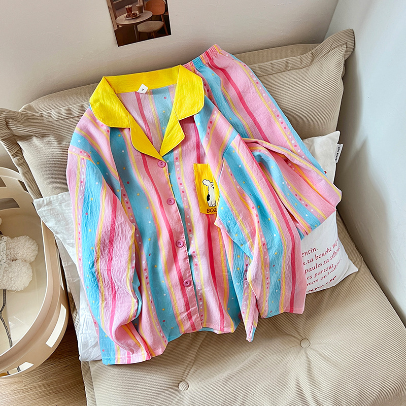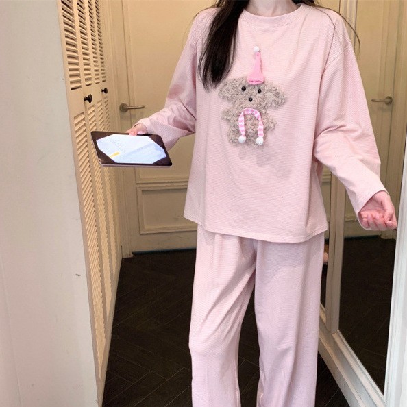 韩国インスタレディース新品少女ピンクストライプラウンドネックデザイン可爱い子犬柄ホームウェアパジャマセット