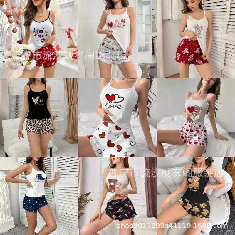 欧米の国境を越えて人気のある女性の家庭服愛プリントストラップパンツはカジュアルで女性のパジャマセットを着ることができる