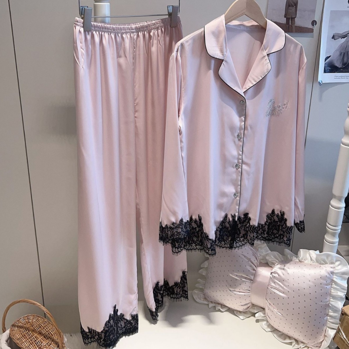 フレンチホットダイヤモンド白鳥春と秋の長袖ズボンアイスシルクパジャマ女性のレースビッグブランドホームウェアセット