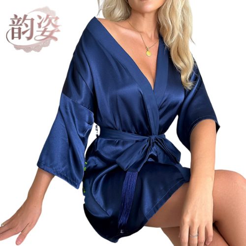 アマゾン2025フリンジ付きレースアップナイトガウン、バスローブ、セクシーなパジャマ、女性用夏秋アイスシルクホームウェア、インナー、欧米風