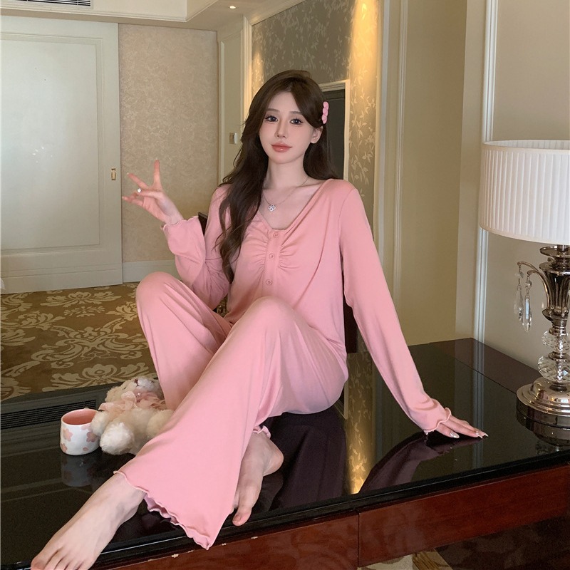 現物パジャマ女春夏秋モーデルコットンセクシー快適vネック長袖長ズボンセットと胸綿ホームウェア