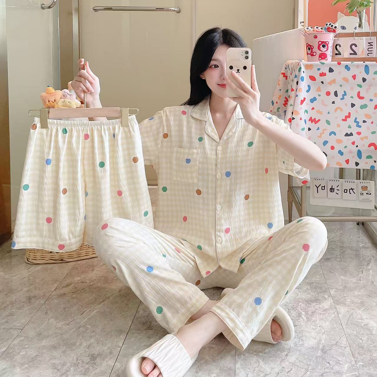 パジャマ女性夏の日糸雲綿しわ布insプリンセス風かわいい半袖ズボン三点セットホームウェア