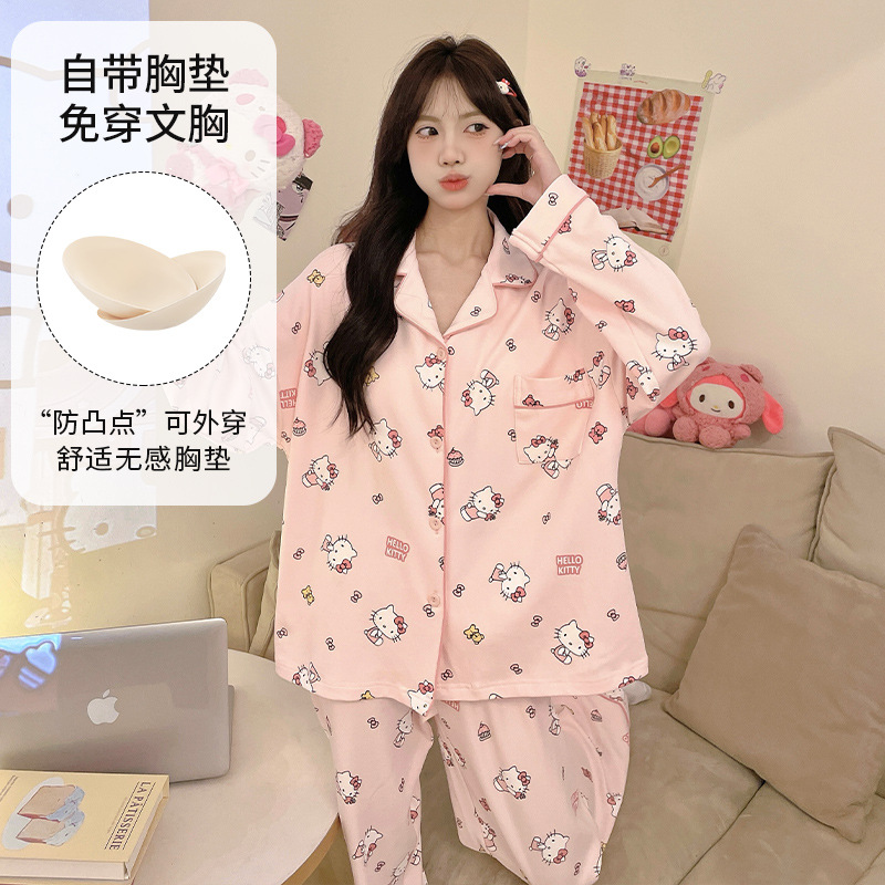 云绵パジャマレディース春秋新作可爱いピンク格子ハローキティカーディガン甘い少女ホームウェア