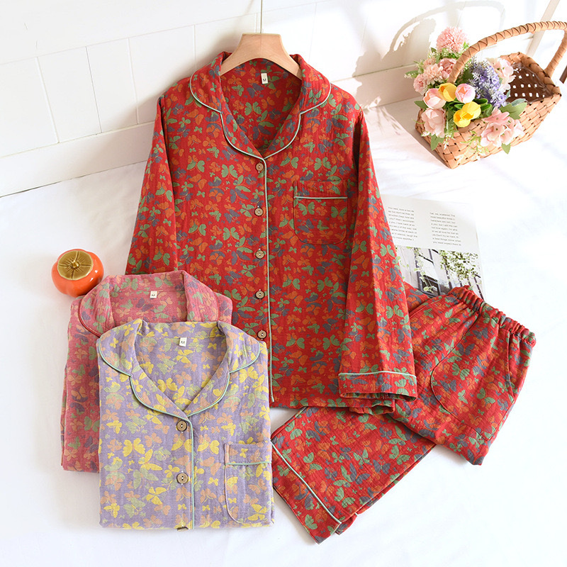 新しいパジャマ女性純綿ガーゼ二重縮布薄い長袖春秋夏襟なし純綿ホームウェアセット
