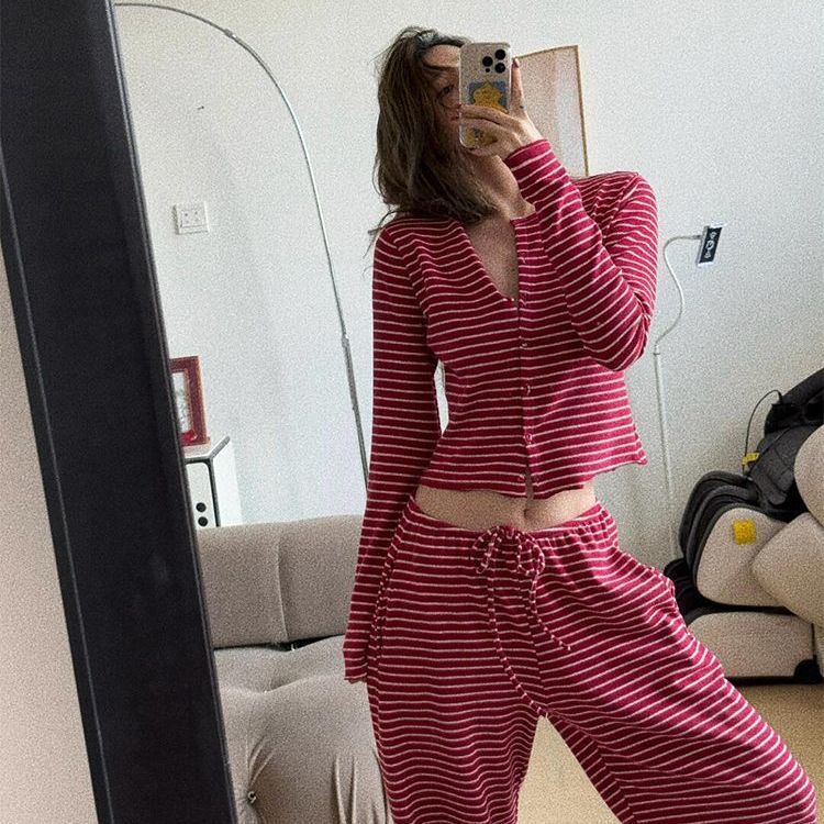 韓国風の甘い純粋な欲望スタイルの女性用高級ストライプパジャマ、春と秋のホットスタイルの学生寮、長袖スーツの外でも着用可能