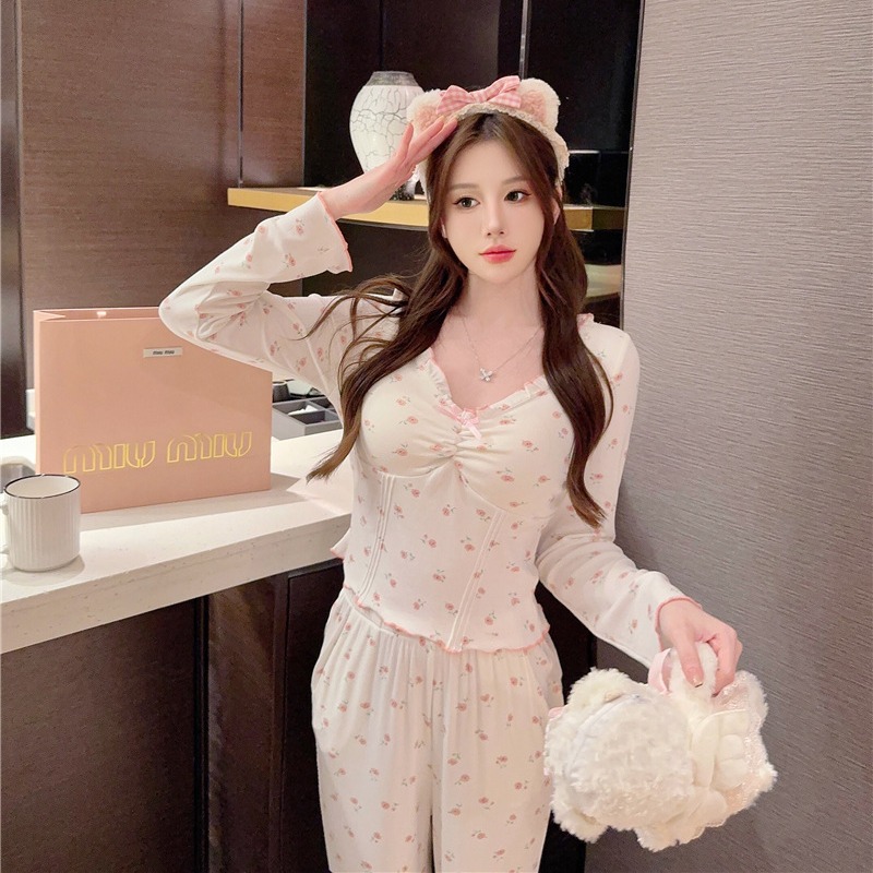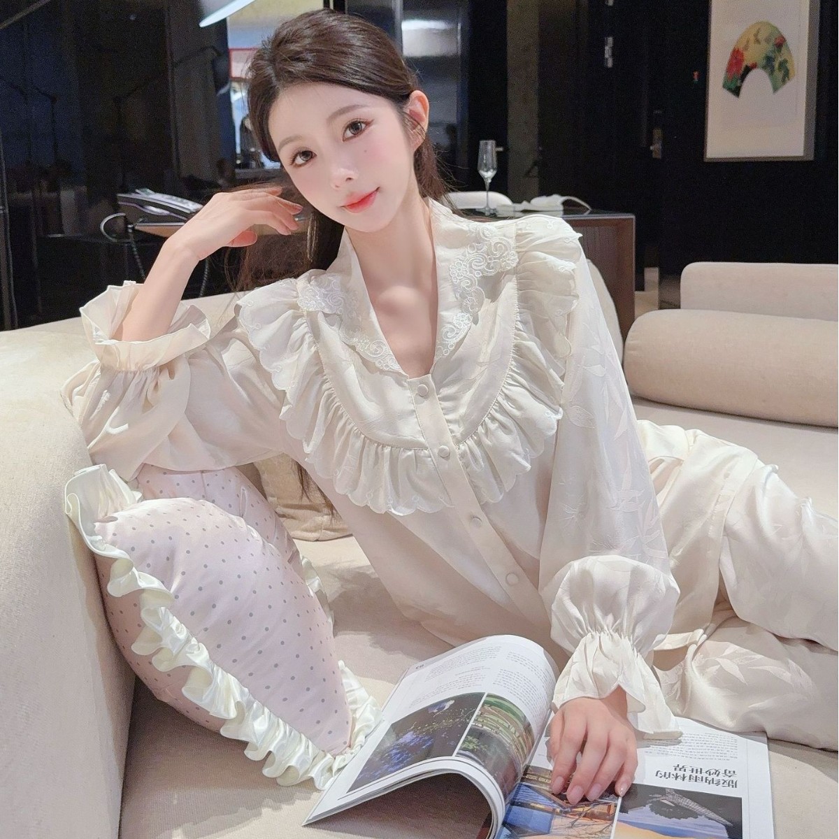 秋の新型2023二重縮の襟をめくるフランスのゆったりとした快適な長袖パジャマ女性の部屋服セット