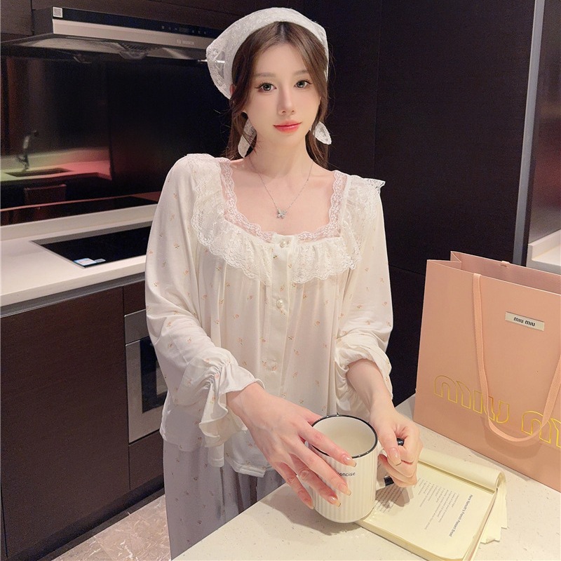 女性用パジャマ、春と秋のモダール綿、花柄レース、快適な長袖長ズボン、ツーピースホームウェア
