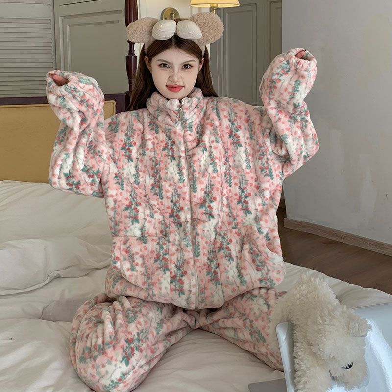 2024冬の新しい甘美な花は保温してパジャマの女性フランネルの家の服の少女のスーツを厚くすることができます。