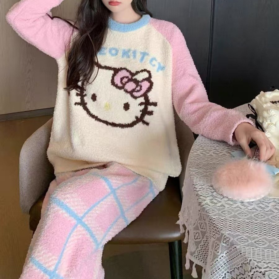 半端の毛のパジャマの女性の秋冬の少女の甘い格子のKitty猫の連名のかわいい家庭服のスーツは外で着ることができます。