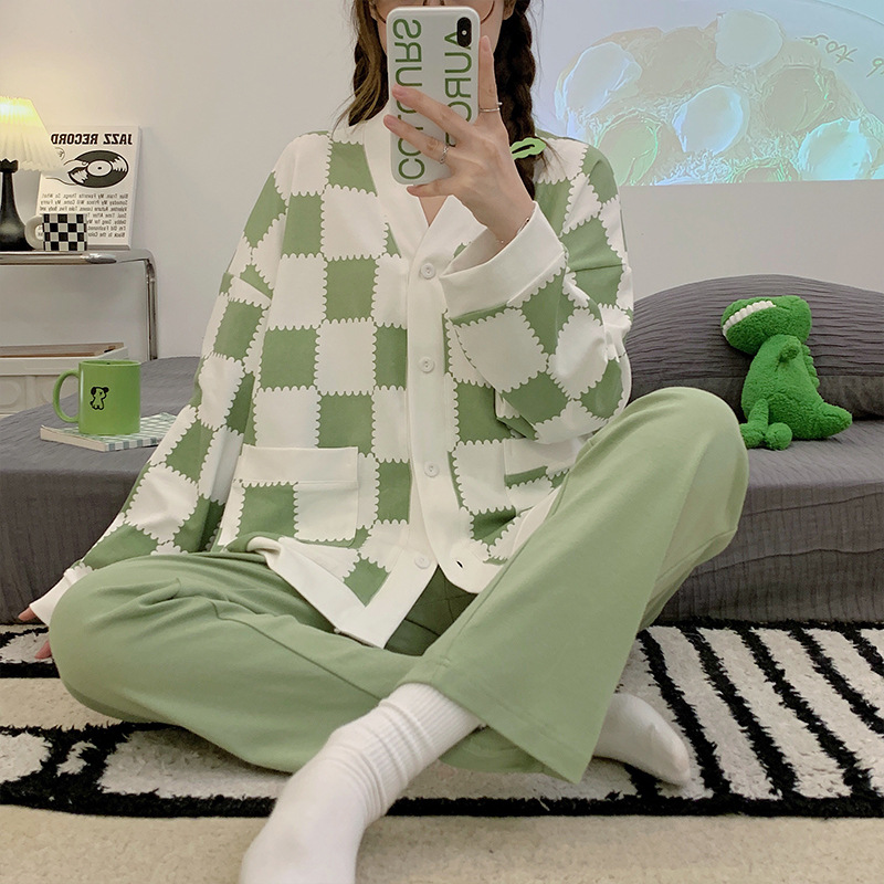 2023年新作パジャマレディースニット綿春秋カーディガン夏ビッグサイズ長袖長ズボンホームウェアアウター可