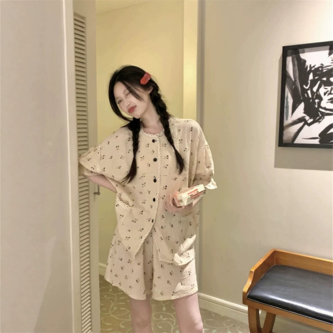 パジャマ女性の夏の半袖ショーツ韓国風甘いレースチェリー純綿ガーゼホームウェアセット屋外で着用可能