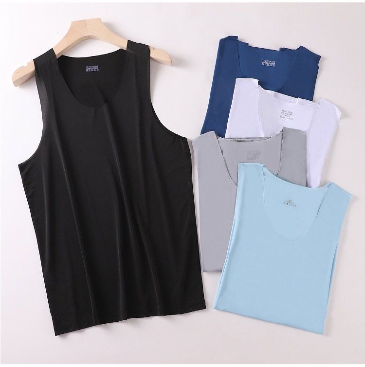 メンズアイスシルクシームレスタンクトップ白夏タイトフィットワイドショルダーラウンドネックスポーツノースリーブボトム薄型ワンピースドロップシッピング