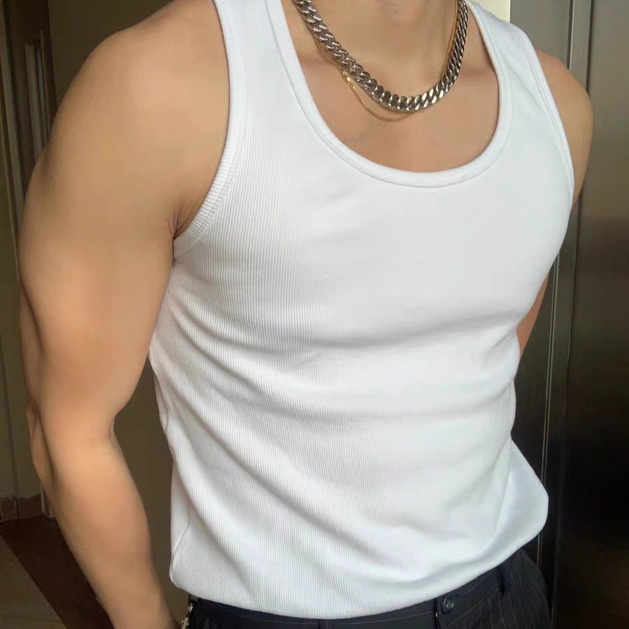 四季型男性100% 純綿リブベスト弾力修身ねじ運動底汗シャツ運動ハードル白