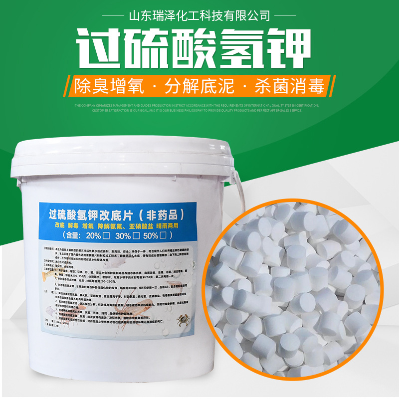 過硫酸水素カリウムは、養殖場の水質調整、汚泥分解、消毒に優れ、大量使用可能。