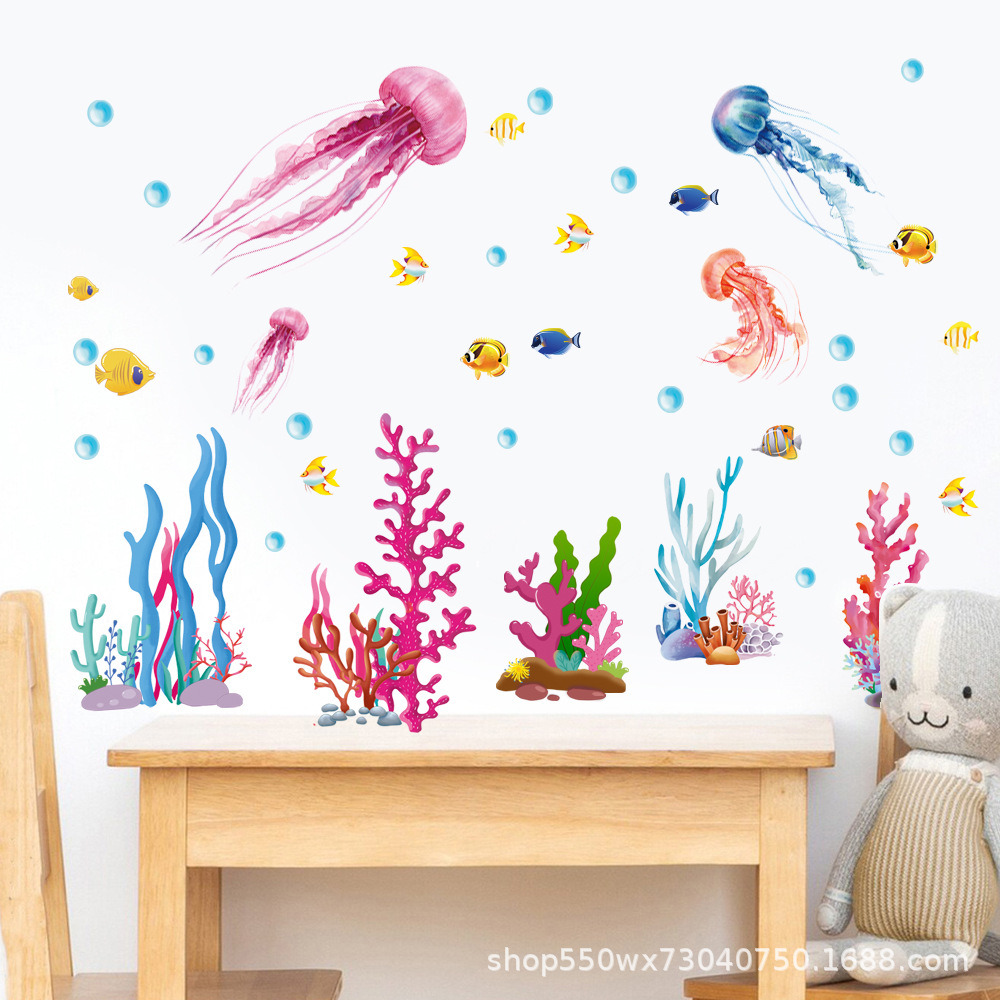 漫画の海底の世界の壁は自分で子供の部屋の幼稚園の防水のトイレの浴室のクラゲの海草の装飾を貼り付けます。