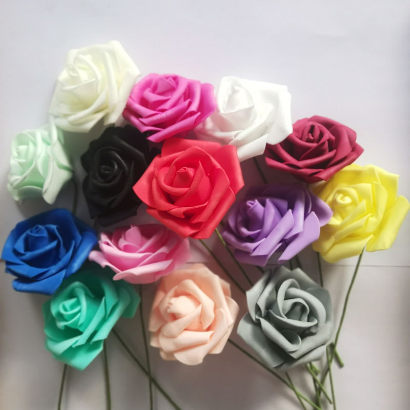 7cmポール付きpe泡バラの花のシミュレーションバラの手は花の結婚祝いの砂糖箱の部品の紙の花を持ちます。