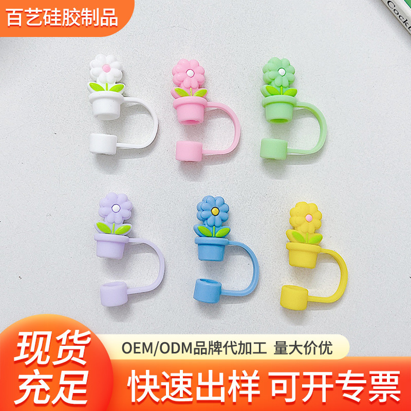 食品グレードのシリコン製ストローキャップ、鉢植えの花の形をした栓、10mm防塵カバー、防塵栓、クリエイティブな模擬鉢植え