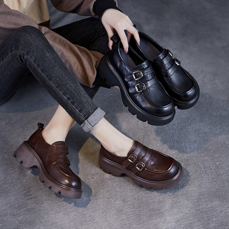 美本色JK楽福靴女性2025春の新しい厚い底の軽い豪華な黒色の小さい革靴のベルトのバックルの靴