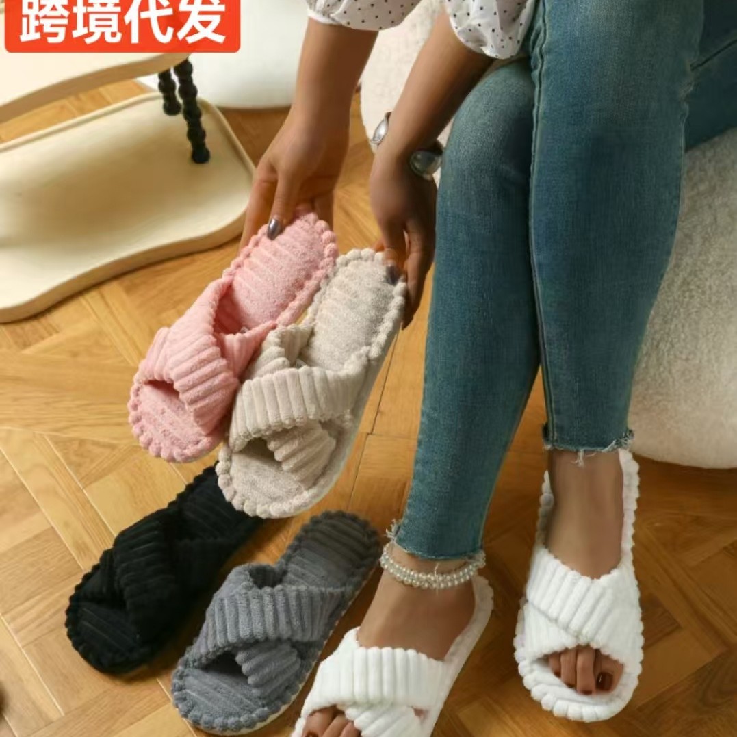 メーカー直供現物クロスボーダー代発開口男女秋冬室内外保温パイル一字開口スリッパ