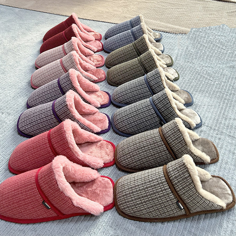 2024起爆笑顔綿スリッパ男女在宅冬盤格子刺繍毛羽スリッパクロスボーダー卸売り