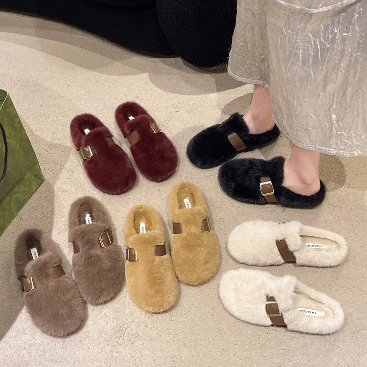 2024秋冬の新型の平毛スリッパの女性靴の包頭とベルベットの保温的なベーケン靴の軽やかなカジュアルなファッション