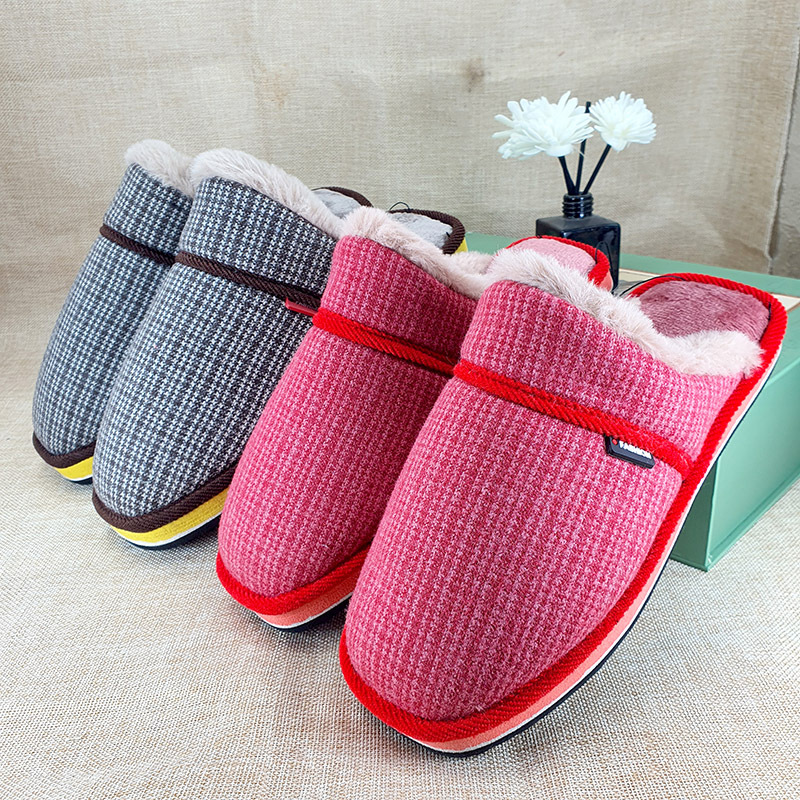 新しい秋冬の毛のぬいぐるみの格子の家庭の室内の床板はカップルを引きずって保温して滑り止めの家庭用綿のスリッパの卸売りを滑ります。